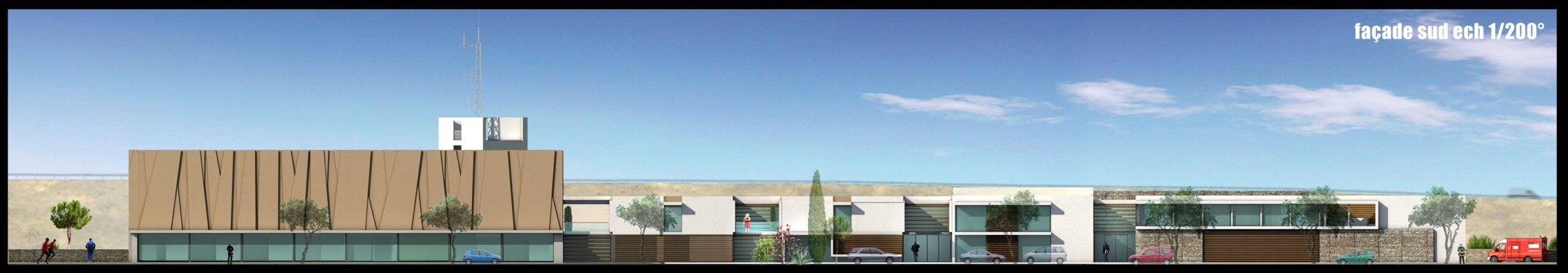 Dans un souci d’intégration paysagère et de protection contre la tramontane, la façade nord de la remise est talutée. Ce talus se prolonge latéralement et s’appuie sur un mur écran en gabions, protégeant l’aire de manœuvre, l’entrée de la remise et la cour de départ.