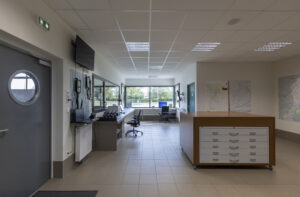 Véritable cœur du dispositif, la remise est conçue comme une « boîte à lumière » regroupant les fonctions d’intervention, de logistique, d’entretien et les espaces techniques. Couvert en sheds, ce volume généreux, culminant entre 5,5 et 7,5 mètres, bénéficie d’un éclairage naturel abondant, à la fois zénithal et latéral.
